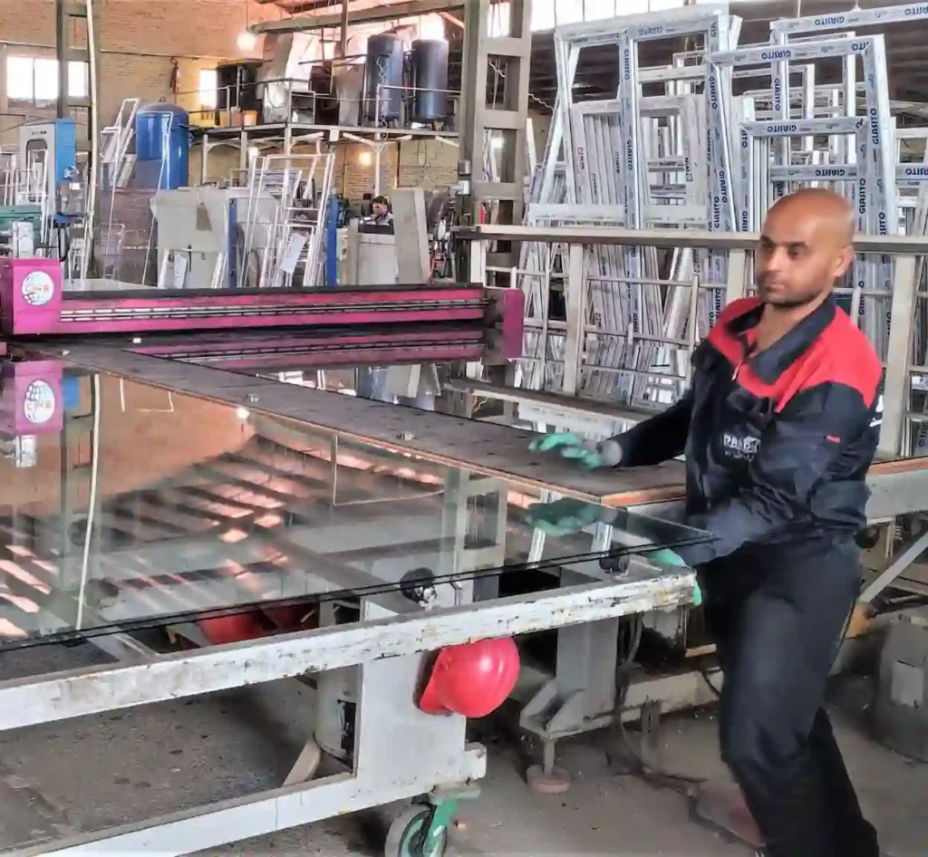 ۹.درزبندی ثانویه (تزریق چسب پلی سولفاید). توسط اپراتورها چسب پولی سولفاید به شیشه ها تزریق شده و بین دو تا سه ساعت بر روی خرک ها قرار می گیرند تا چسب ها خشک شوند.
